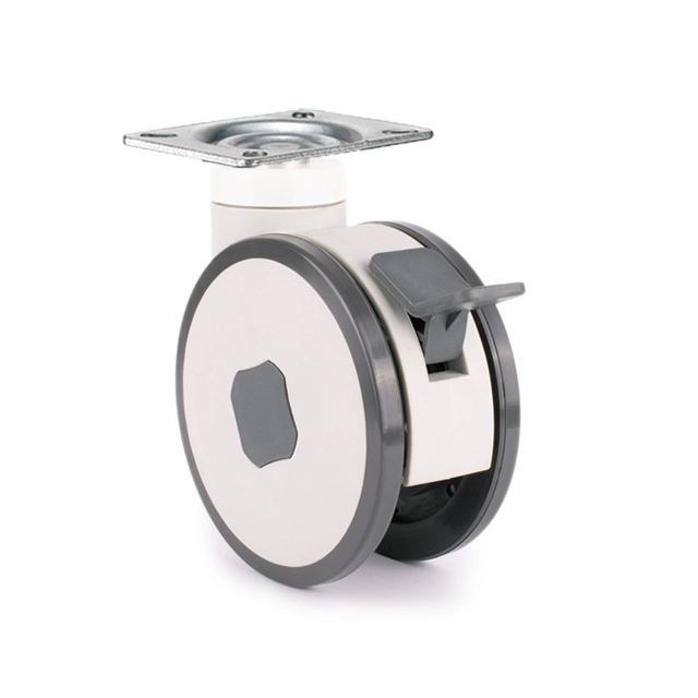 این محصول با بهرهگیری از بدنه پلیمری یکپارچه و چرخ تقویت شده مرکزی بر روی محور غلطکی، حرکتی فوقالعاده روان و بیصدا را ارائه میدهد. محور اتصال با پین در قسمت بالایی محصول، نصب سریع و آسان را تضمین میکند. تنها با فشردن پدال، چرخها و محور اصلی به صورت همزمان قفل میشوند و از هرگونه حرکت ناخواسته تجهیزات جلوگیری میکنند.